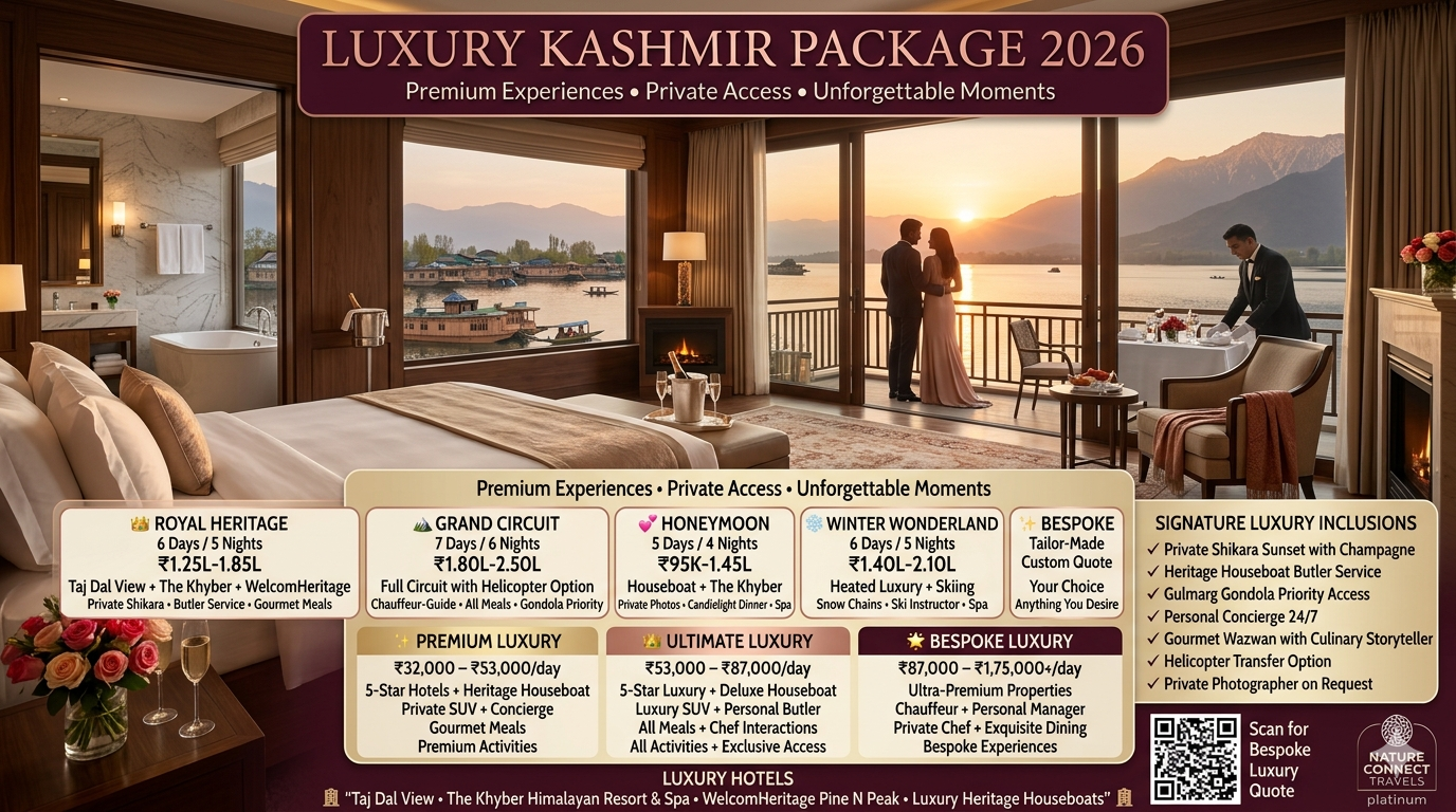 A comprehensive luxury kashmir package includes luxury accommodation (5-star hotels, heritage houseboats), private chauffeured transport, all meals (often with gourmet experiences), a dedicated trip concierge, private guides for sightseeing, exclusive activity access, and all internal permits. International flights and personal expenses are usually excluded .